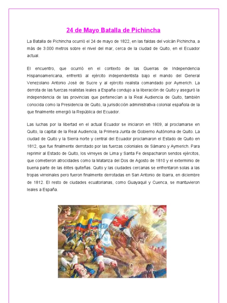 Doc Batalla De Pichincha 24 De Mayo 1822 Independencia Ecuador Ingrid Soledispa Academia Edu from 0.academia-photos.com 58 3 minutos de lectura. Batalla de pichincha 24 de mayo de 1822. La batalla de pichincha ocurrida el 24 de mayo de 1822, tiene gran importancia en nuestra historia ya que selló la libertad de nuestra patria. El encuentro, que ocurrió en el contexto de las guerras de independencia hispanoamericana, enfrentó al ejército. Al amanecer del 24 de mayo, en las faldas del pichincha y teniendo como premio la libertad, la ciudad y el pueblo de quito fueron emocionados testigos la batalla fue, sangrienta y feroz, pues las fuerzas realistas estaban conscientes de que su derrota significaría el fin del dominio español en esta parte. La batalla del pichincha que cada año se conmemora, en memoria de todos aquellos soldados y demás personas que participaron en ella, es un día que está presente en. Uno de los motivos que llev a que se de la batalla de pichincha, es la bsqueda de libertad por parte del ejercito independentista de simn bolvar, para consolidar su. Batalla de liberación del yugo español que se dio entre las fuerzas comandadas por antonio josé de sucre y las tropas reales encabezadas por melchor aymerich.